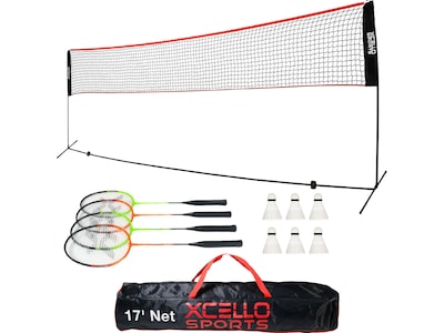 This Excello Global Products Xcello Sports set includes four adult-size lightweight aluminum badminton rackets. There are two green rackets and two orange rackets: perfect for playing doubles. No tools required, play anywhere. The 17' net sets up in minutes with simple push-together tubes connected by bungees. Great on grass, sand, or pavement. Adjust the height from 3' to 5.3'.