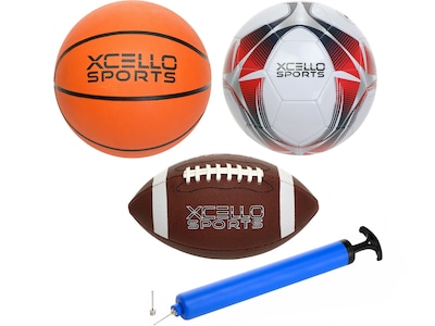 - Set contains: size 5 soccer ball, junior-size football, official size B7 basketball, and ball pump