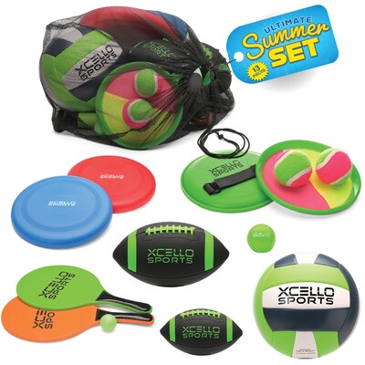 Xcello Sports Summer Set w/ Toss + Catch, Paddle Ball, Volleyball, Frisbee, Junior and Mini Football, Water Ball, Bag and Pump