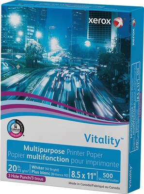 Xerox® Vitality® Multipurpose Printer Paper is a versatile paper, good for most jobs. It’s perfect for home and office documents with a crisp, professional look and features a whiter 92 GE brightness and higher opacity.