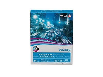 Prepare your office printer or copier for a full day of document creation with this ream of Xerox Vitality multipurpose printer paper. The 24-pound paper weight brings durability to your paperwork while preventing ink and toner from bleeding through. The whiter white color and 92 brightness rating bring out the color in every print job, and this multipurpose printer paper features ColorLok technology for fast drying times.