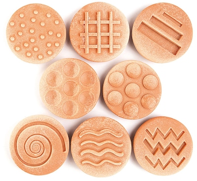 - The set of eight stones includes four raised/bumpy designs (circles, dots, wavy lines and a grid) and four indented/hollow designs (circles, lines, zigzags and a spiral)