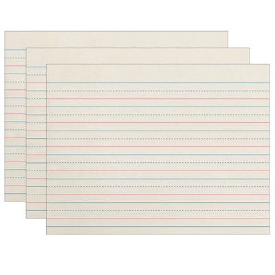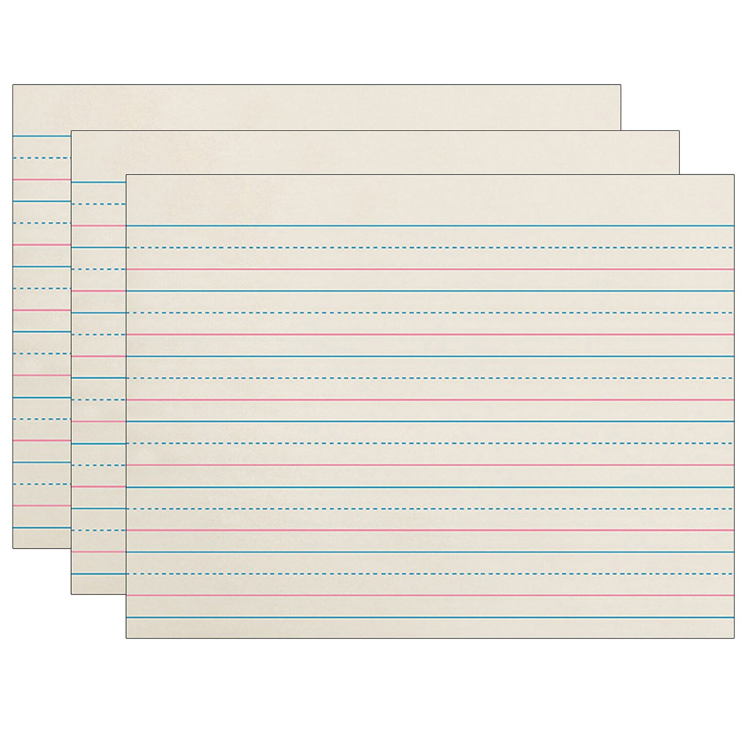 - Clean white newsprint that's 3/4" ruled on both sides with 3/8" blue dotted midline, red baseline and 3/8" skip space