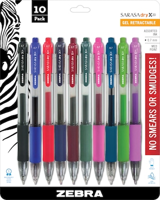 Zebra Sarasa Dry X20 Retractable Gel Pen, Medium Point, 0.7mm, Assorted Ink, 10 Pack (46881)