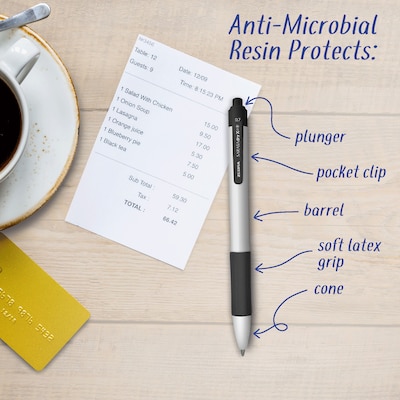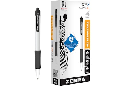 The same Sarasa Dry X20+ you've come to love, now with special built-in protection to help suppress the growth of bacteria. This pen uses a special resin incorporated into the plastic that makes it difficult for germs, bacteria, and viruses to grow. Take notes with sharp confidence and this Zebra black retractable gel pen. The thick barrel with a contoured rubber grip provides enhanced control and comfort. The pen glides across the pages without smearing or smudging due to its rapid-dry ink. The Sarasa Dry X20+ comes in a pack of 12, making it easy to keep your home or office stocked.