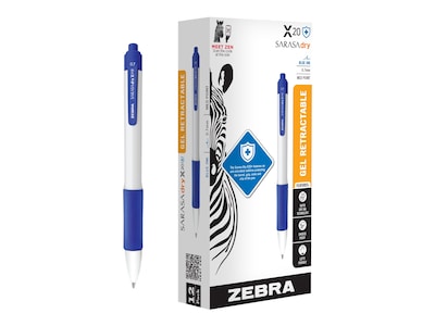 The same Sarasa Dry X20+ you've come to love. Now with Zebra special built-in protection to help suppress the growth of bacteria. This pen uses a special resin incorporated into the plastic that makes it difficult for germs, bacteria, and viruses to grow. Take notes with sharp confidence and this Zebra Sarasa Dry X20+ blue retractable gel pen. The contoured rubber grip provides enhanced control and comfort, while the visible ink supply ensures you never run out of ink unexpectedly. This l pen is made with a compact design and comes in a pack of 12, making it easy to keep your home or office stocked.