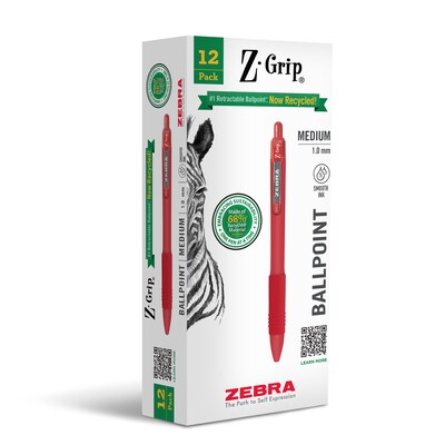 Zebra Z-Grip Recycled Retractable Ballpoint Pen, Medium Point, 1.0mm, Red Ink, Dozen (20630)